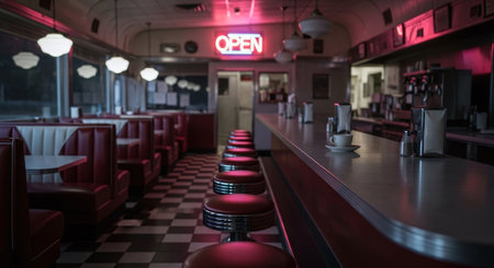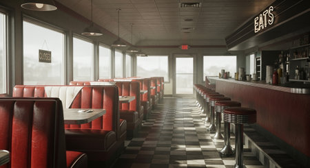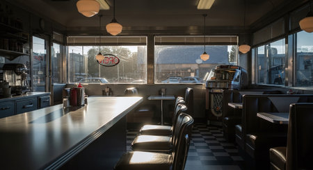 Cozy Retro American Diner Interior with Classic 60s and 70s Decor, Warm Lighting, and Booth Seating