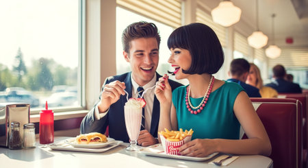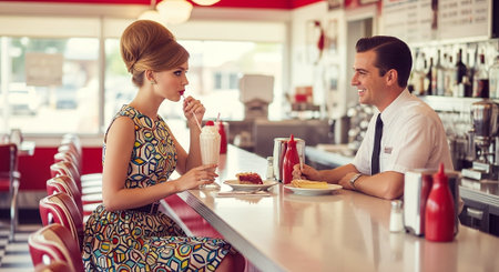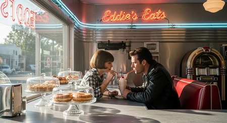A young couple sits at the counter of a classic retro diner, sharing a milkshake through two straws. The woman wears a checkered shirt and the man a leather jacket. Behind them, a neon sign reads Eddie's Eats and a vintage jukebox is visible. Display cases on the counter hold donuts and pies. The diner interior red vinyl booths and chrome accents, illuminated by warm, ambient lighting. The atmosphere evokes a sense of nostalgia and casual intimacy.