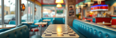 Classic diner interior with checkered table in a lively atmosphere during early evening hours