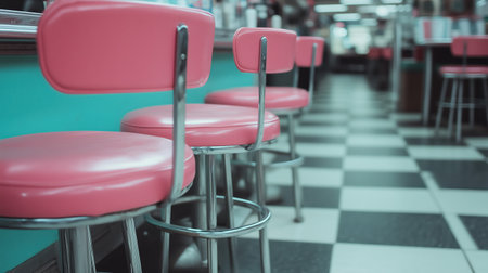 Retro diner seating with pink stools and checkered floor creates nostalgic atmosphere. vibrant colors and classic design evoke sense of warmth and comfort.
