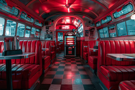 A train car featuring red leather seats and a checkered floor, A retro diner with red leather booths and a jukebox playing oldies tunes