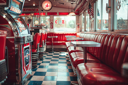 A classic diner setting with a checkered floor and vibrant red booths, A retro diner with red leather booths and a jukebox playing oldies tunes