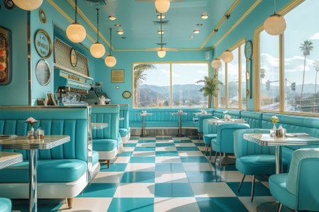 Retro 1950s diner interior with checkerboard floor and colorful booths. That the image is generated using AI.