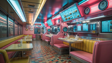 Empty retro diner interior showing pink booths, digital menus, and colorful tiled floor. Ai generated image