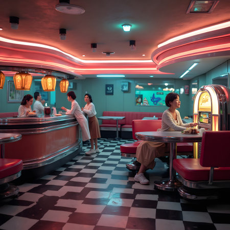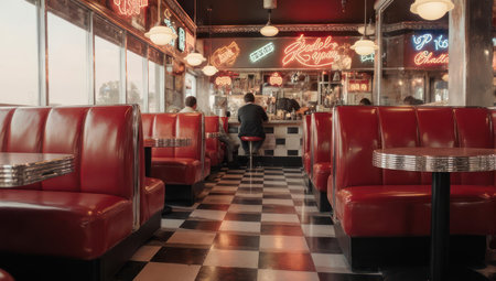 Classic diner scene, vibrant red booths, checkered floor, neon signs, people seated, retro feel