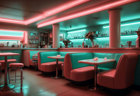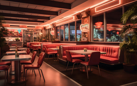Retro american diner interior with neon lights and vintage decor. That the image is generated using AI.