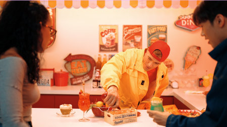 Happy man with yellow shirt turn around to pick and add tabasco sauce in to food while standing behind bar. Attractive diverse friend talking and enjoy eating while holding glass of juice. Regalement.