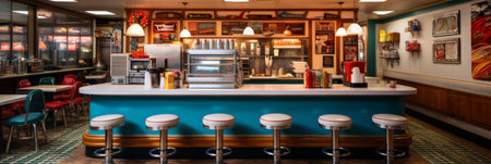 Colorful retro american diner interior design, bar, cafe.