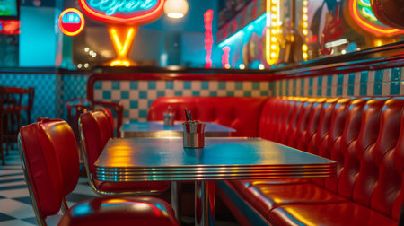 Vintage American diner with red leather booths and vibrant neon signs