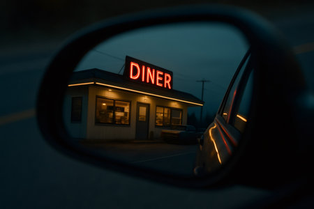 Neon diner sign reflecting in car side view mirror, showcasing a classic American roadside stop at twilight