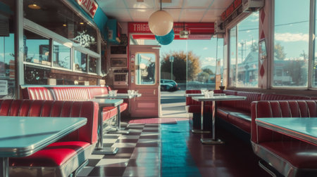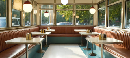 Charming Retro Diner Interior Featuring Cozy Booths, Classic White Tables, and Sunlit Atmosphere