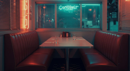 Empty retro diner booth at night, illuminated by atmospheric neon lights. Vintage aesthetic, perfect for cinematic, nostalgic, or urban themes.