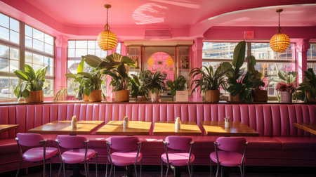 Retro 1950s diner interior with vintage decor and pink booths. That the image is generated using AI.
