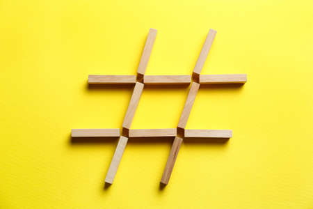 Hashtag symbol made of wooden blocks on yellow background, top view