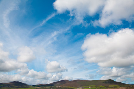 bright blue sky white clouds over green Irish hills background with copy space Dingle peninsula Ireland