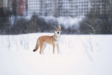 Beautiful ginger dog, close-up portrait of red male walking in a forest. Winter time. . Copy space