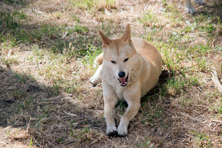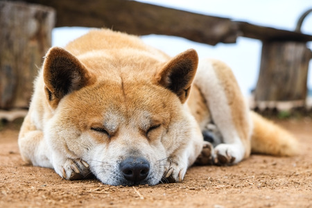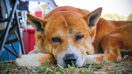 Close up orange old stray dog sleeping on the grass field with selective focus on foreground.
