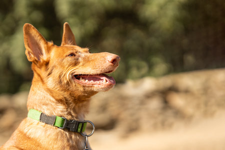 Photo with copy sapce of a Podengo dog smiling while looking up at its owner in a park