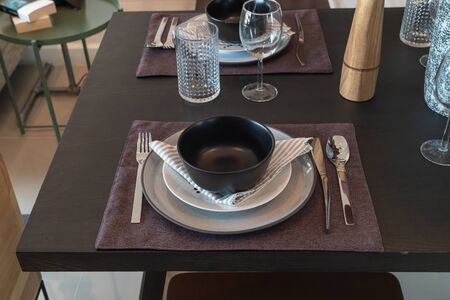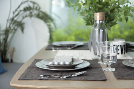 Serving festive table, gray plates, minimalism, scandinavian design at living room