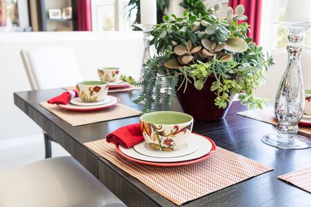 dish ware sets arrange on dining table inside eating room of home, image blur background
