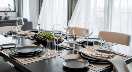 Stylish dining table composition with elegant tableware and beautiful kitchen and personal accessories. Beauty in the details. Template. : Generative AI