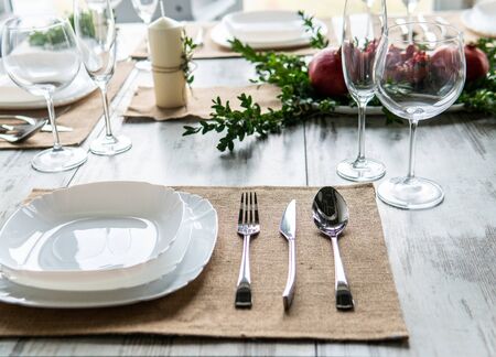 Close up white porcelain tableware plates on green place mats and empty champagne flutes ready for dinner. Table settings wait for guests at home or restaurant, wooden bowl with decoration