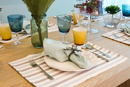 Wooden table served with plates, forks, spoons, glasses, blue napkins in the restaurant