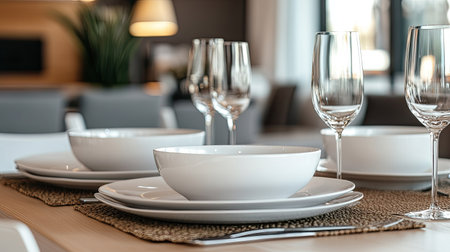 A beautifully arranged dining table featuring sleek white dishware and elegant glassware. Ideal for home dining experiences or special occasions.
