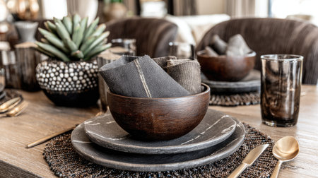 Discover a beautifully arranged dining table featuring elegant plates, textured napkins, and natural decor, perfect for modern interior design inspiration.