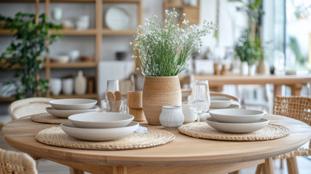 A beautifully arranged dining table featuring elegant dishware, a decorative vase with fresh greenery, and a cozy setting perfect for entertaining family and friends.