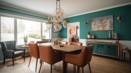 Interior design inspiration of Mid-Century Modern Scandinavian style home dining room loveliness decorated with Wood and Leather material and Statement Light Fixture .Generative AI home interior