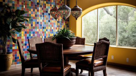 Interior design inspiration of Mediterranean Bohemian style home dining room loveliness decorated with Wood and Ceramic material and Mosaic Pendant Light .Generative AI home interior design .