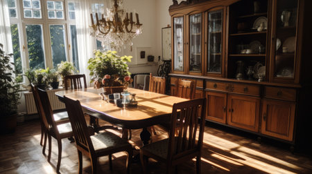 a wooden hutch with an edwardian beauty is showcased in this photo. the natural lighting creates a candid atmosphere as sunrays shine upon the dark amber and gold tones of the hutch. the viennese actionism influence is evident in the domestic interiors. ai generated