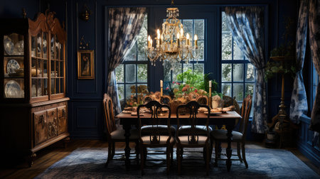 Interior design of Dining Room in Traditional style with Statement chandelier decorated with Upholstered dining chairs, patterned curtains material. Traditional architecture. Generative AI AIG24.