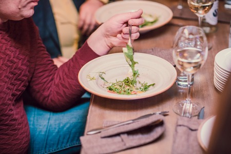 There is a salad close-up. hands properly hold cutlery in the restaurant. table etiquette.