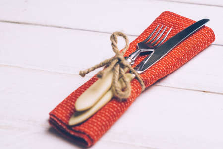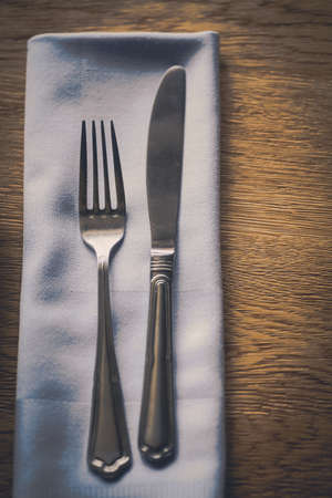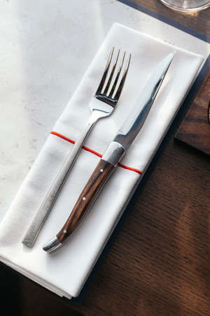 Knife and fork with napkin on wooden table for fine dining. Luxury cutlery set.