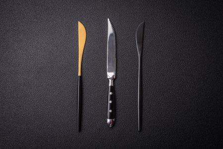 Kitchen knife made of steel on a dark textured background. Kitchen utensils on the table