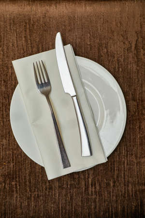 Knife and fork, cutlery on a brown dining table. Utensils and crockery for preparing dinner