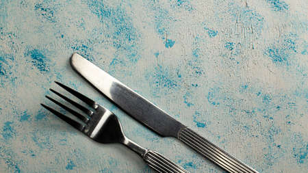 Crossed steel knife and fork on tredny soft blue paper background with side copy space