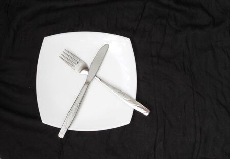 Empty plate, fork and knife over black background. Clean plate and cutlery on light background. Top view.
