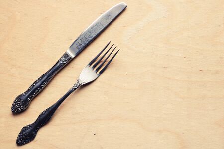 knife and fork on wooden table.cutlery on background