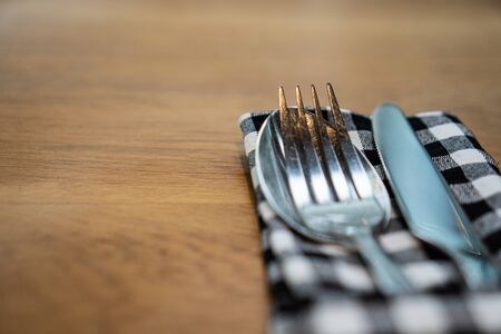 close up knife fork and spoon with napkin on wooden table texture and text space. Background for dining and restaurant.