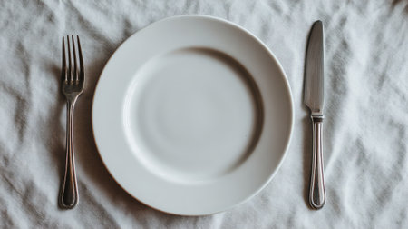 A minimalist dining setup showcasing an empty white plate, accompanied by a stainless steel fork and knife, on a textured linen background, evoking simplicity and elegance.