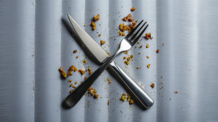 A fork and knife on a white cloth with some food, AI