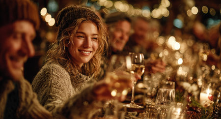 Young woman in warm sweater smiles while raising glass at festive gathering, surrounded by friends at a decorated table, embodying joy and celebration