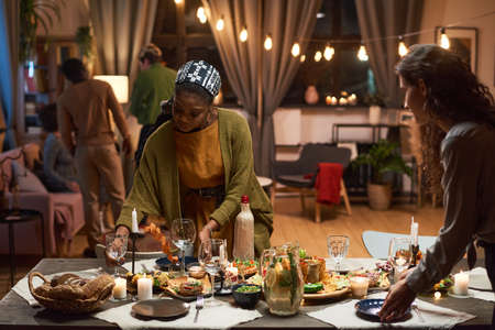 Two women setting the dining table for festive dinner with their friends in the living room