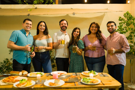Latin happy women and hispanic men having fun together after dinner in the backyard drinking beer