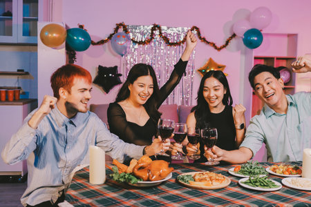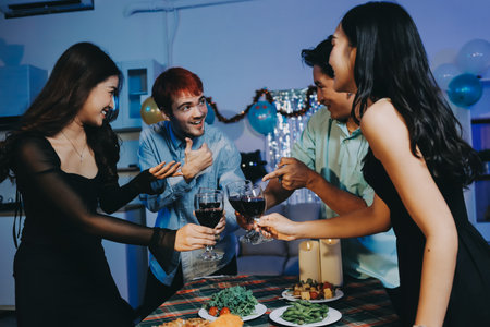 Group of young people toasting with glasses of alcohol drinks while having dinner together at the table during a party