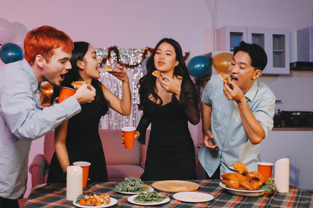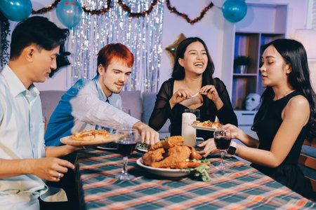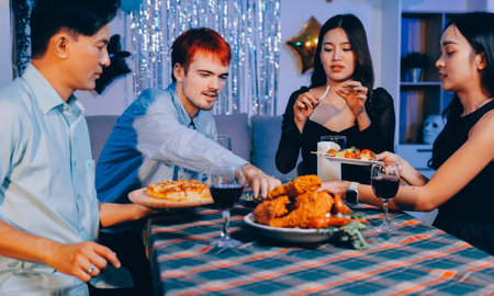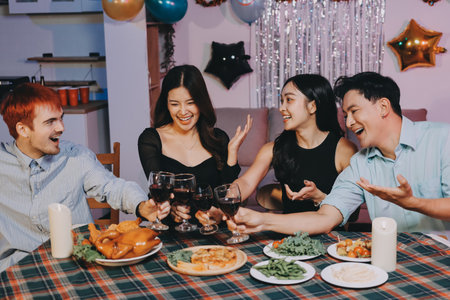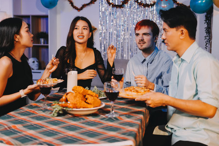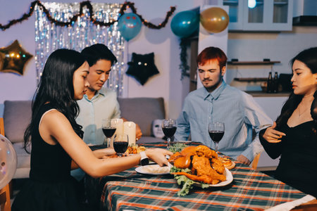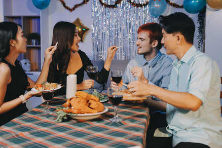 Asian group friends eating dinner at home, they are happy to talk.