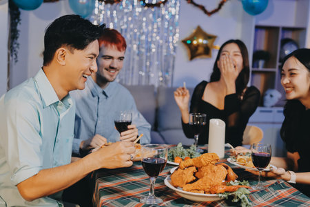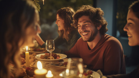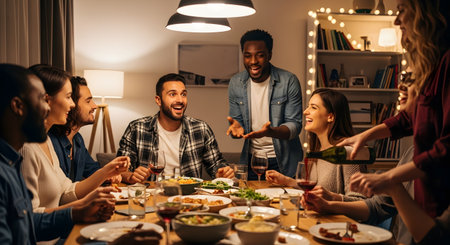 A diverse group of happy friends laughs and talks around a dining table filled with food and wine glasses during a cozy dinner party at home. One man stands, gesturing and smiling, while a woman pours red wine, creating a warm, joyful, and social atmosphere.